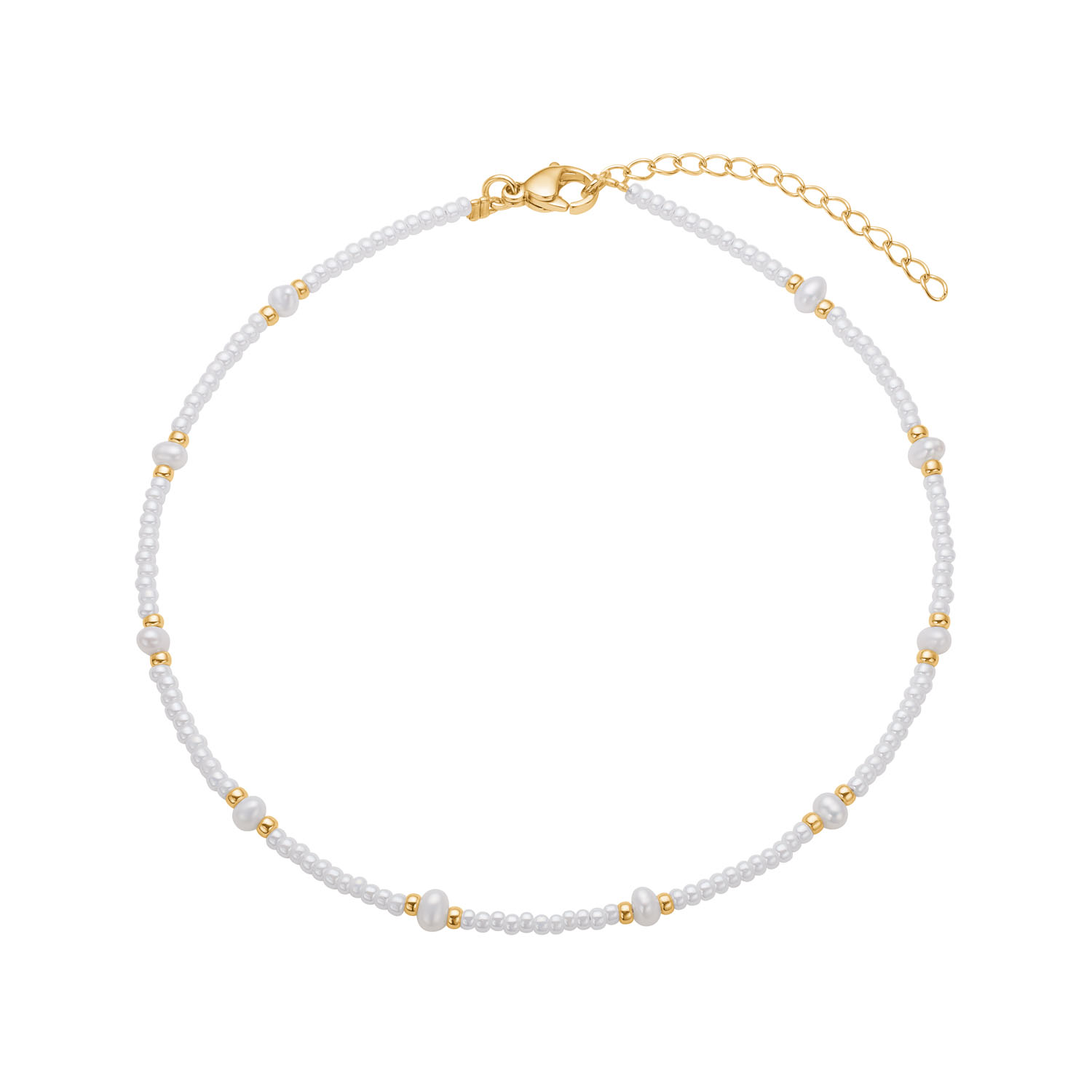 Ankelkæde i stål, belagt med 14 karat guld, pyntet med ferskvandskulturperle og miyuki sten. Ankelkæden er 25 cm + 4 cm i forlænger.