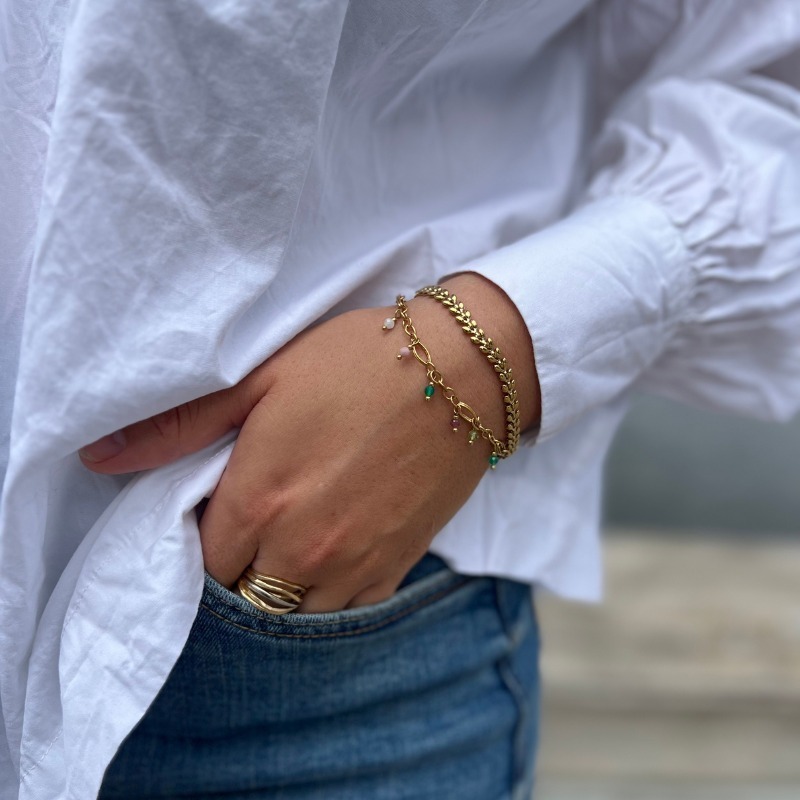 Armbånd i stål, belagt med 14 karat guld, med fine ædelsten. Armbåndet er 18 cm + 3 cm forlænger.