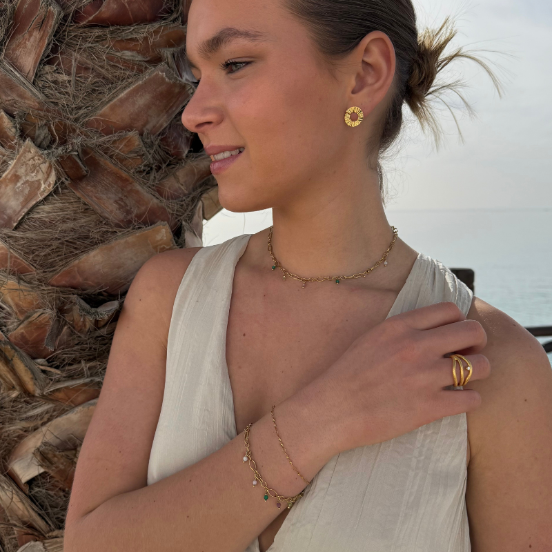 Ædelsten: Månesten, pink opal, grøn agat, turmalin, peridot, grøn agat.