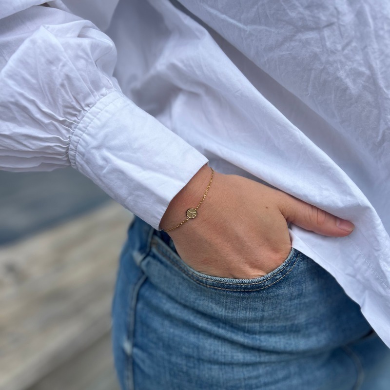 Armbånd i stål, belagt med 14 karat guld, med peace tegn. Armbåndet er 18 cm + 3 cm forlænger.
