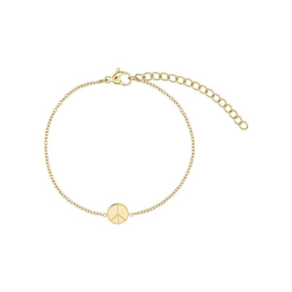Armbånd i stål, belagt med 14 karat guld, med peace tegn. Armbåndet er 18 cm + 3 cm forlænger.