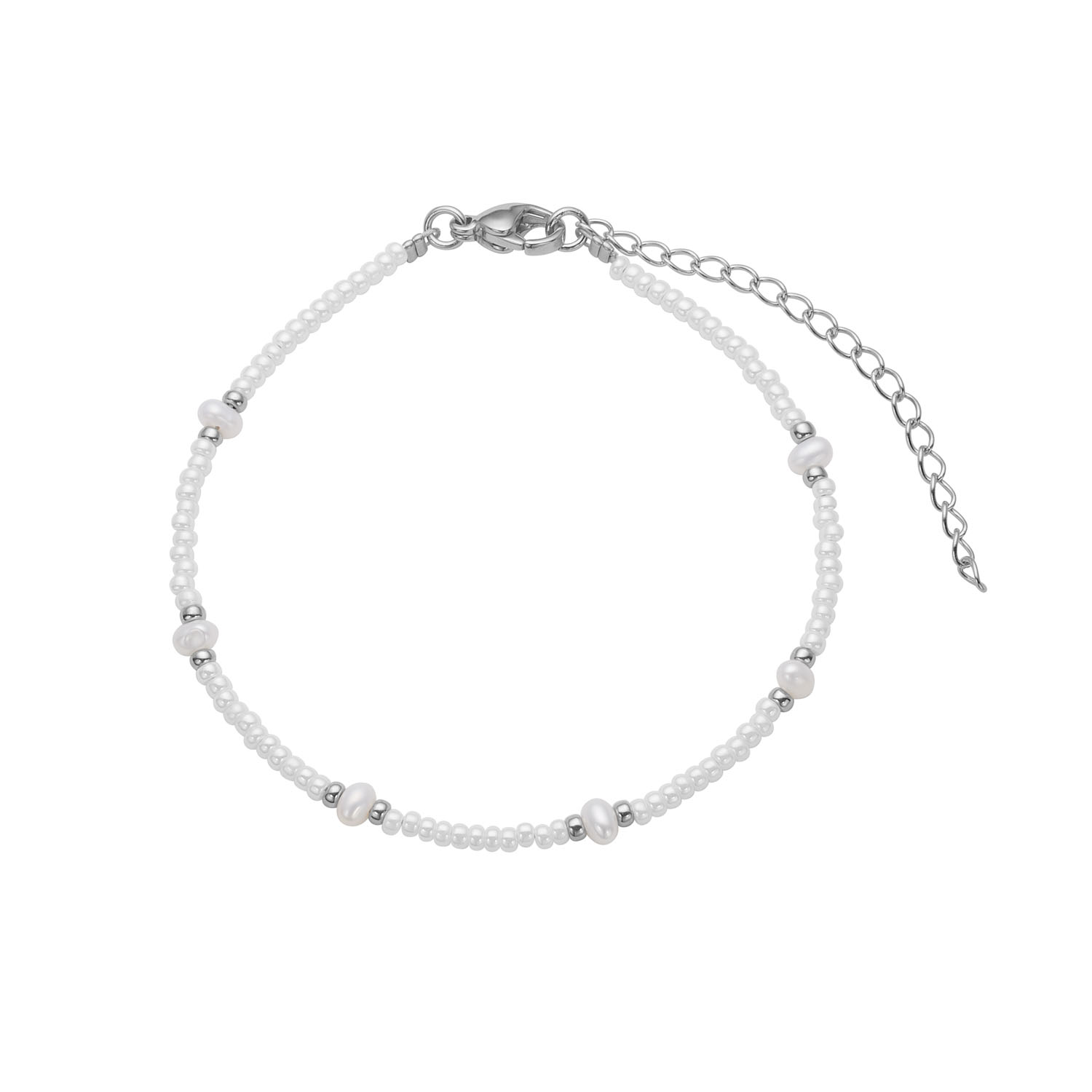 Armbånd i stål med ferskvandskulturperler og miyuki sten. Armbåndet er 17 cm + 5 cm forlænger.