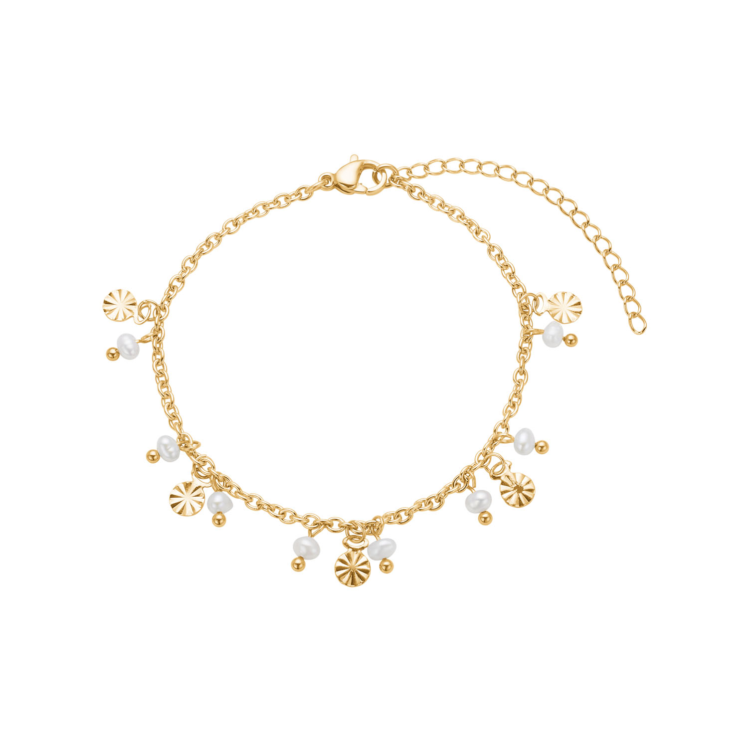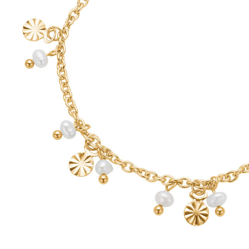 Armbånd i stål, belagt med 14 karat guld med ferskvandskulturperler. Armbåndet er 17 cm + 5 cm forlænger.