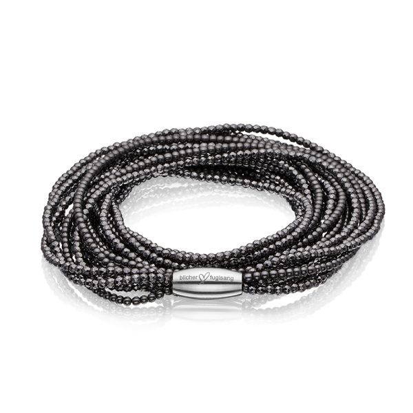 Facetteret Hæmatitkæde med 5 strenge, 2 strenge med runde sten, 3 strenge med facetter, i 54 cm (Small), 57 cm (Medium) eller 60 cm (Large).