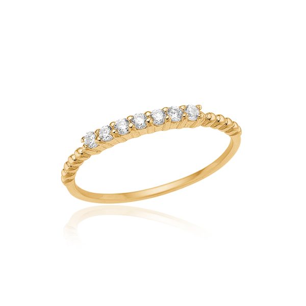 Stilren ring i guldbelagt sølv, pyntet med funklende zirkoner i midten og guldkugler på siderne.