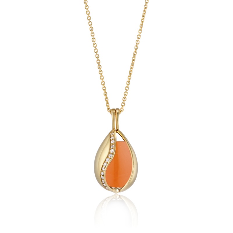 Fin halskæde i forgyldt sølv med blank overflade og med åbne- og lukkefunktion, så du nemt og enkelt kan skifte ædelsten. Halssmykket er i guldbelagt sølv pyntet med 14 zirkonia og leveres med en smuk orange karneol.