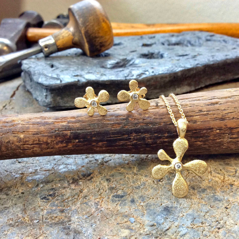 Ørestikker med yndefulde blomster og zirkoner i matteret guldbelagt sølv.