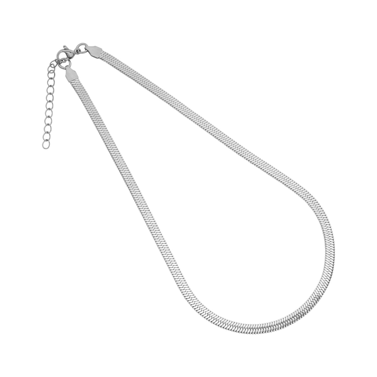 Slangehalskæde i stål, et smukt og klassisk design. Halskæden er 5 mm bred og længden er 42 cm + 5 cm forlænger.