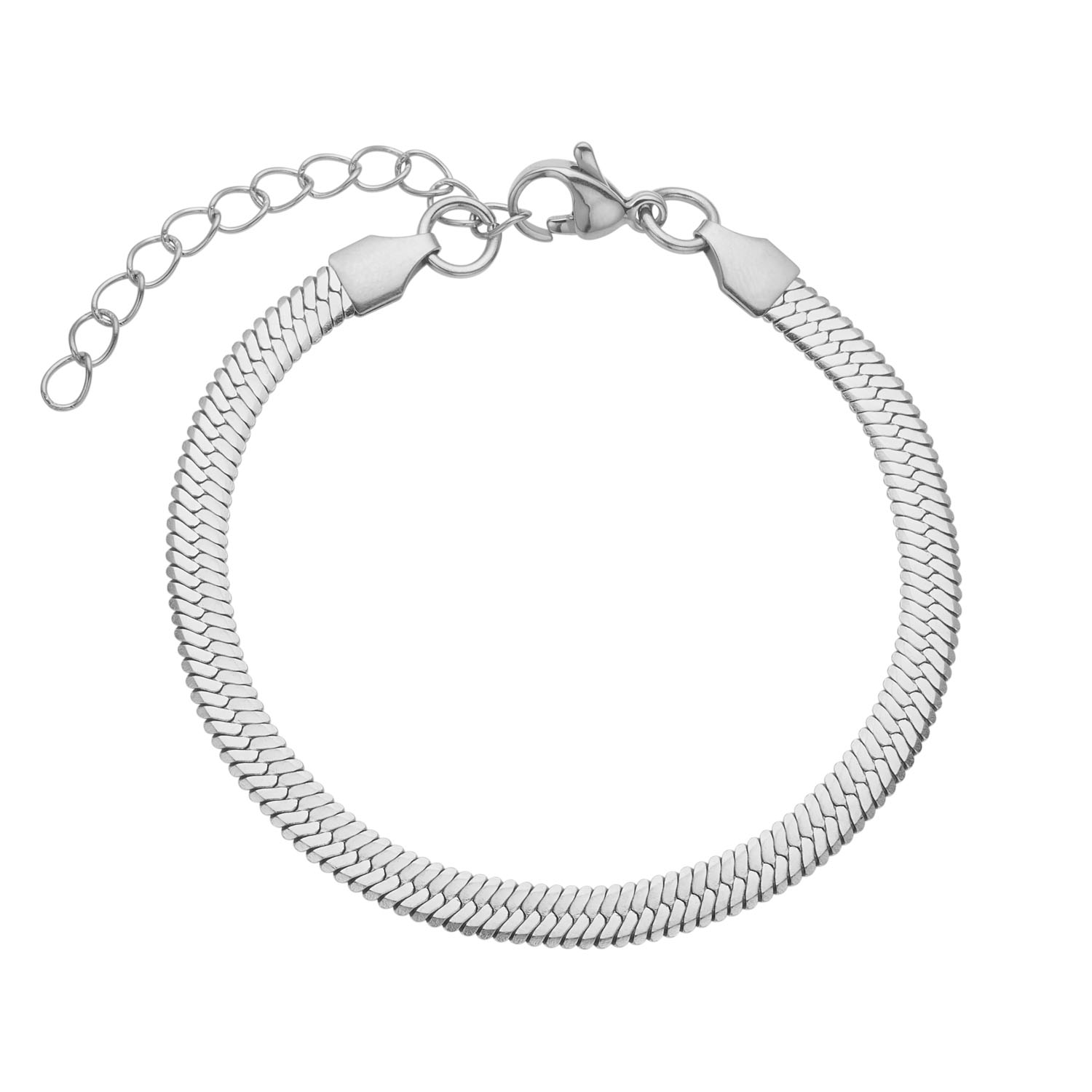 Bredt slangearmbånd i stål. Armbåndet er 5 mm bredt og fås i 2 længder 16 cm + 3 cm forlænger og 18 cm + 5 cm forlænger.