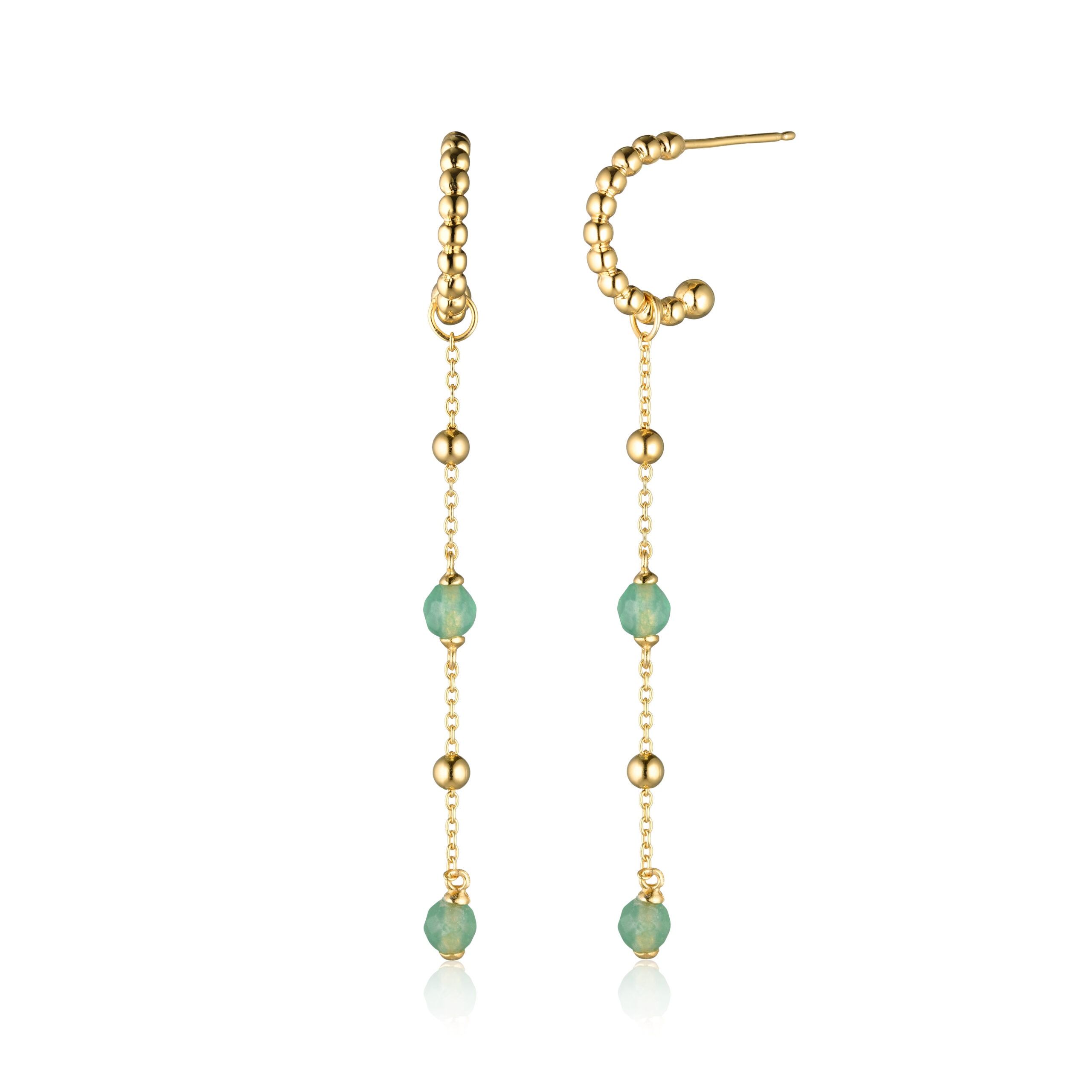 Øreringe med kugler og her pyntet med kæder med kugler og grønne aventuriner med facetter.
