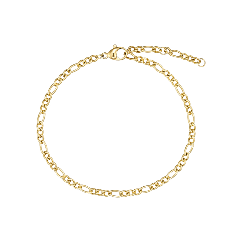 Ankelkæde i stål, belagt med 14 karat guld, i det klassiske figarodesign. Ankelkæden er 29 cm – fleksibel i størrelsen.