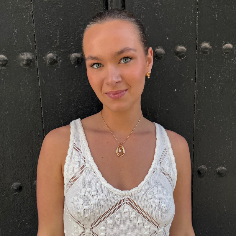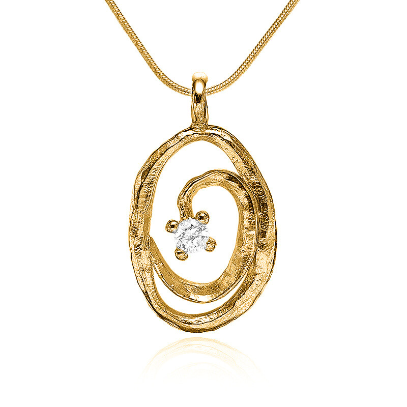 Halssmykke der er udformet som en spiral på en lidt skæv facon, har sin helt egen unikke og rå udtryk. Vedhænget er i forgyldt sølv med en smuk zirkonia.