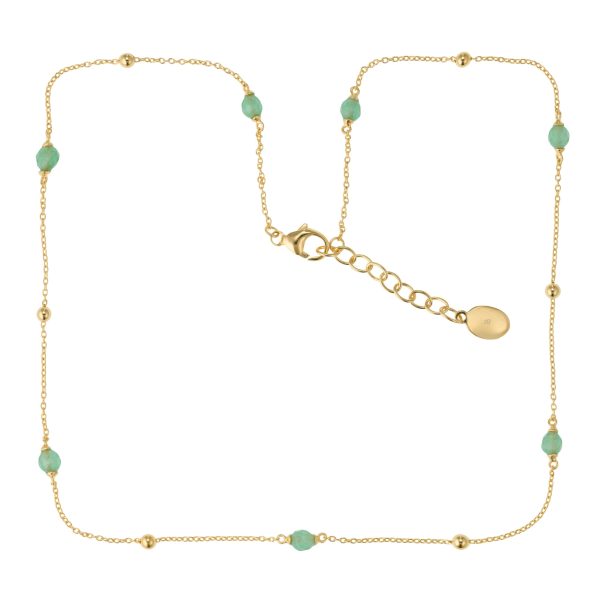 Fin og enkel halskæde i forgyldt sølv med fine kugler og smukke grønne aventuriner med facetter. Halskæden er 42 cm lang med ekstra 3 cm som forlænger.