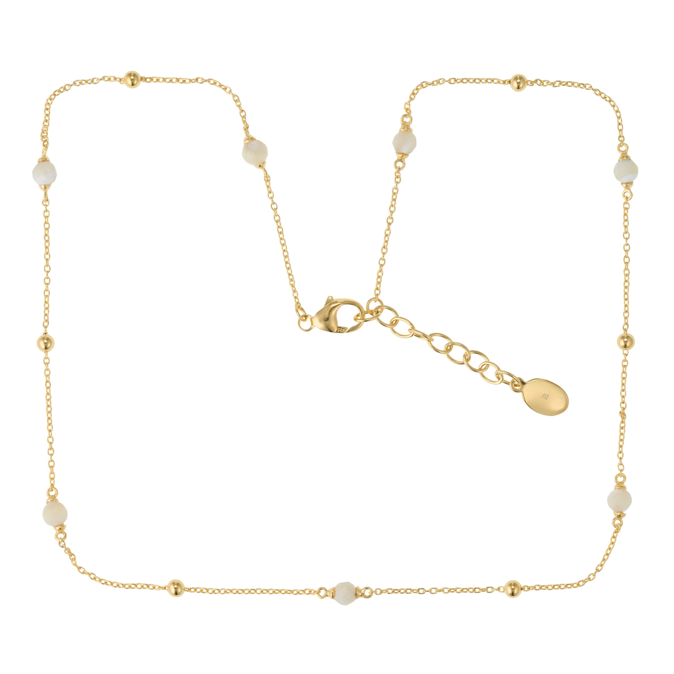 Fin og enkel halskæde i forgyldt sølv med fine kugler og smukke sten med facetter i hvid perlemor. Halskæden er 42 cm lang med ekstra 3 cm som forlænger.