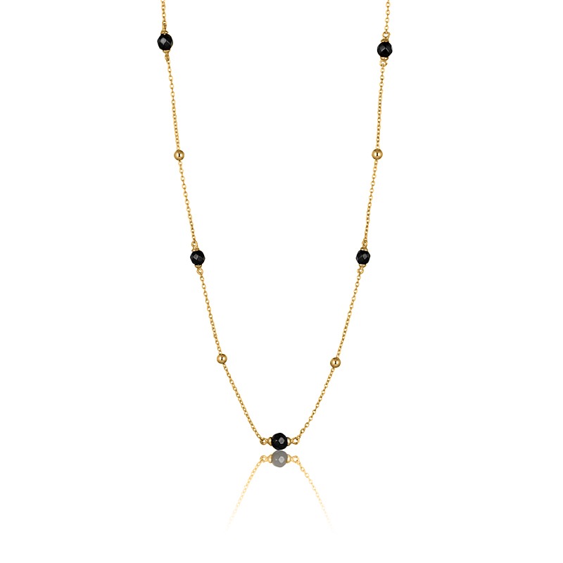 Fin og enkel halskæde i forgyldt sølv med fine kugler og smukke sten i sort onyx med facetter. Halskæden er 42 cm lang med ekstra 3 cm som forlænger.