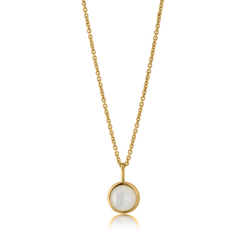 Smukt vedhæng i guldbelagt sølv med hvid perlemor. Et enkelt og feminint smykke. Vedhænget er ens på begge siden, derfor er smykket også fin i en lang kæde.