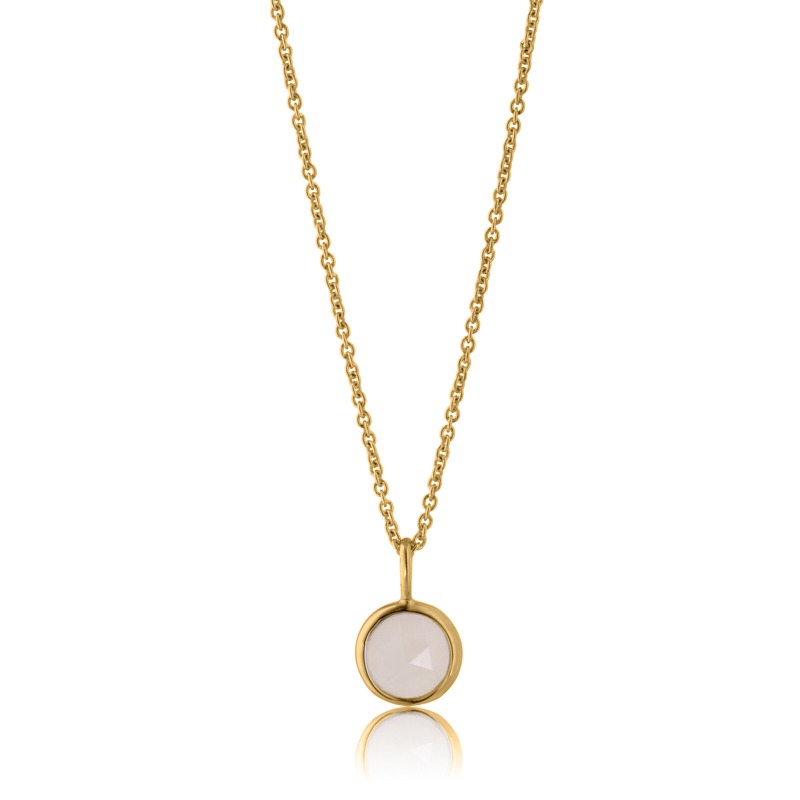Smukt vedhæng i guldbelagt sølv med rosakvarts. Et enkelt og feminint smykke. Vedhænget er ens på begge siden, derfor er smykket også fin i en lang kæde.