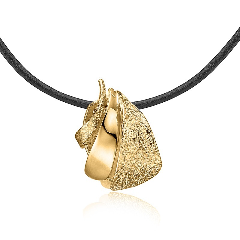 Vedhængi forgyldt sølv med 3 overflader icecrushed, blankpoleret og sandblæst. Smykket har både et råt og feminint udtryk.