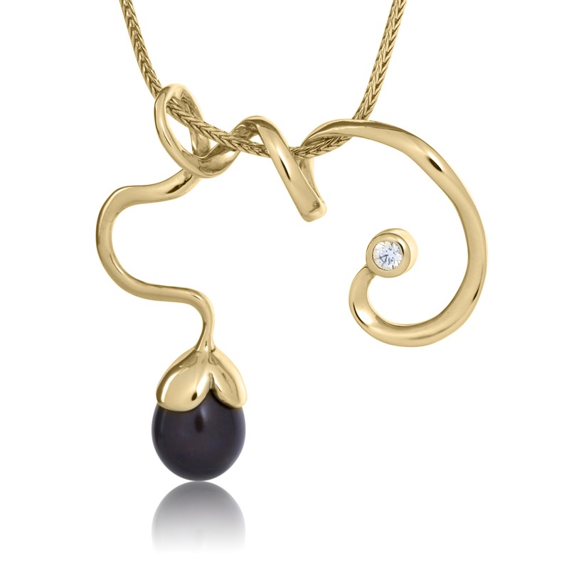 En eventyrlig halskæde i en skøn organisk form. Smykket er dekoreret med en sort ferskvandskulturperle og en smuk zirkonia.