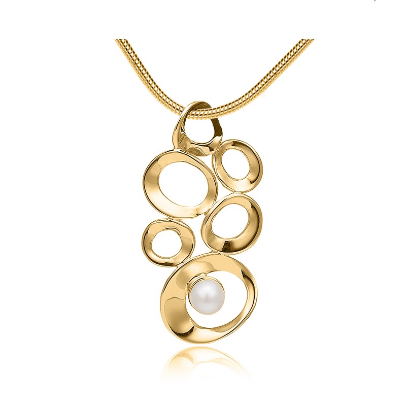 Et halssmykke med et funklende sving i guldbelagt sølv, pyntet med en klassisk ferskvandskulturperle.