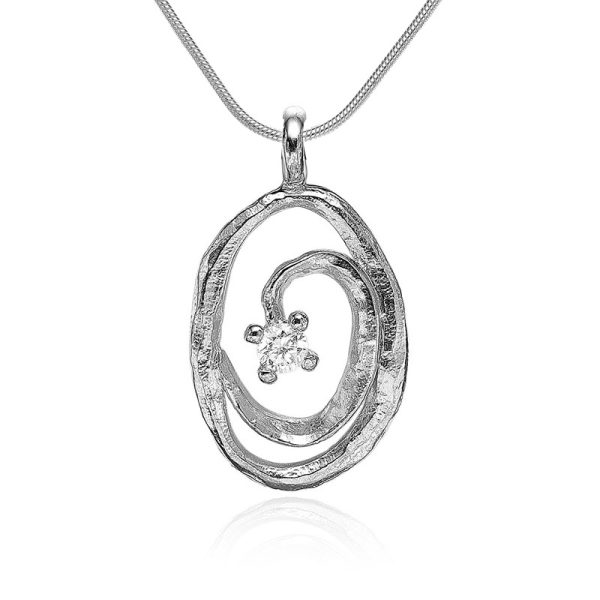 Halssmykke der er udformet som en spiral på en lidt skæv facon, har sin helt egen unikke og rå udtryk. Vedhænget er i sølv med en smuk zirkonia.