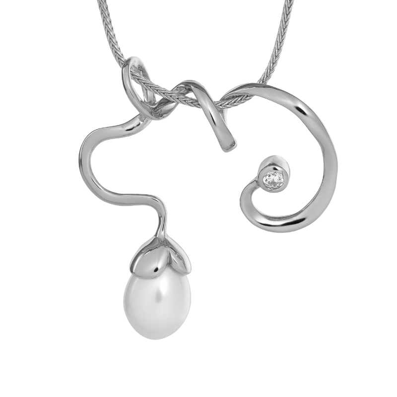En eventyrlig halskæde i en skøn organisk form. Smykket er dekoreret med en hvid ferskvandskulturperle og en smuk zirkonia.