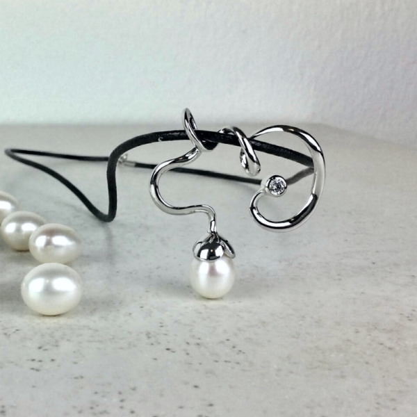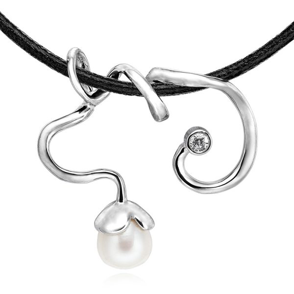Halssmykke i en skøn organisk form med funklende sving, og smukt dekoreret med hvid ferskvandskulturperle og zirkonia.