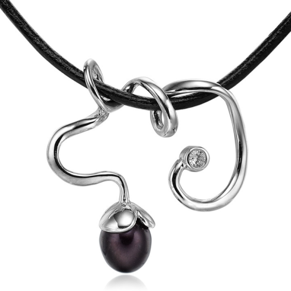 Eventyrlig halskæde i en skøn organisk form. Et halssmykke med et funklende sving, der er dekoreret med en sort ferskvandskulturperle og zirkonia.