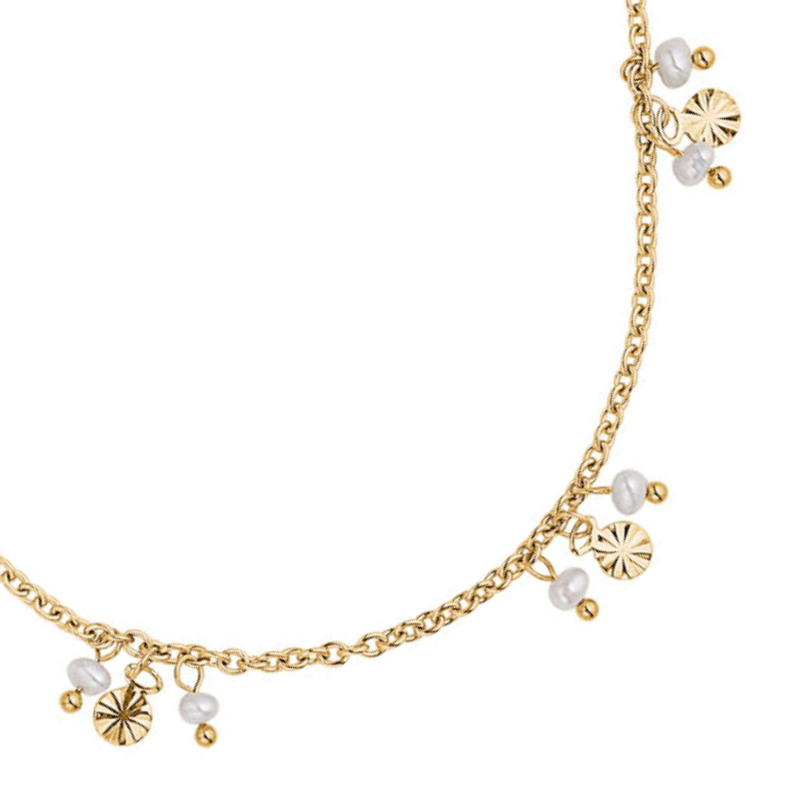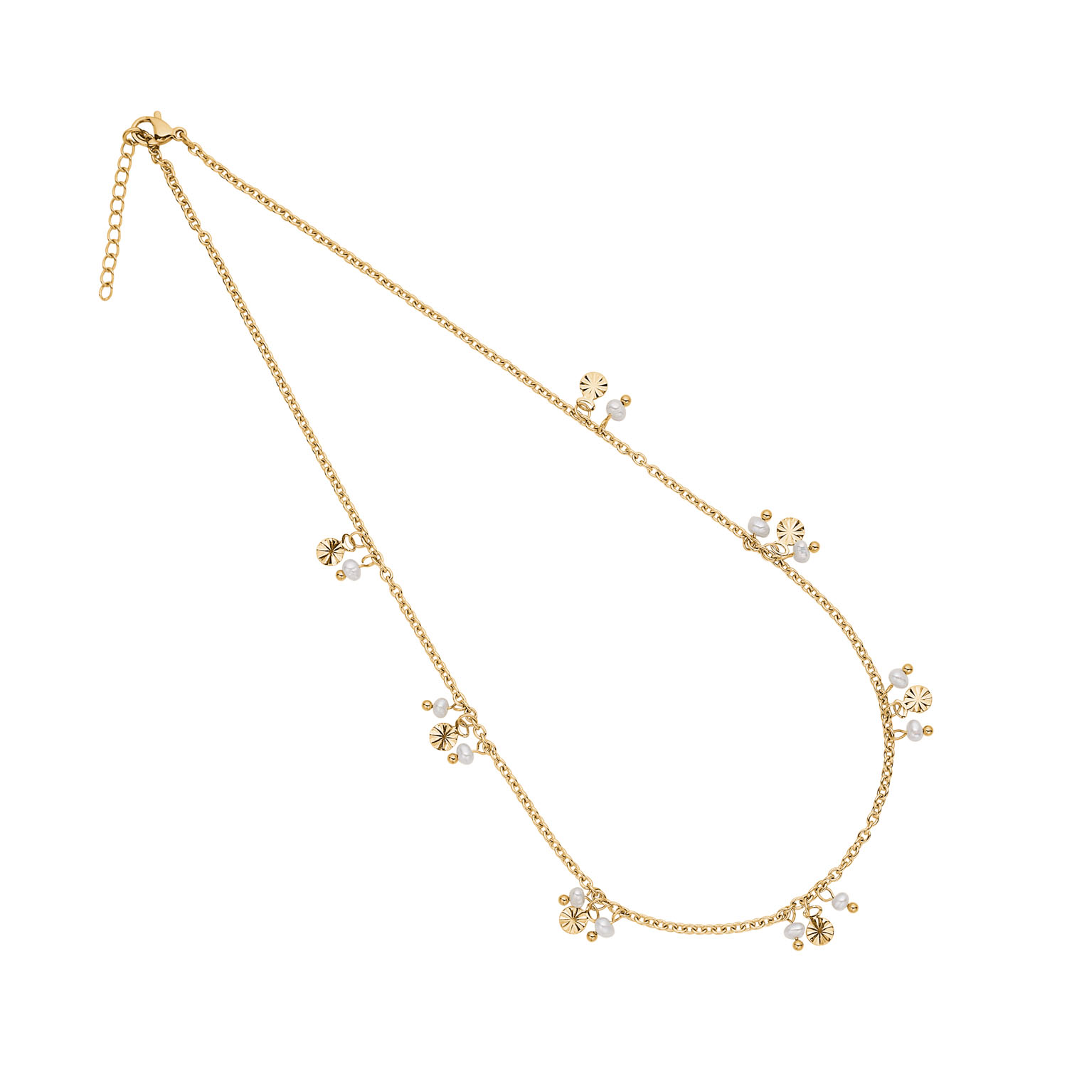 Halskæde i stål, belagt med 14 K guld med ferskvandskulturperler. Halskæden er 42 cm + 3 cm forlænger.