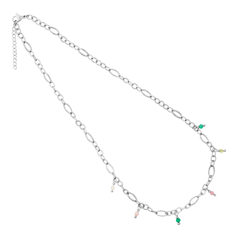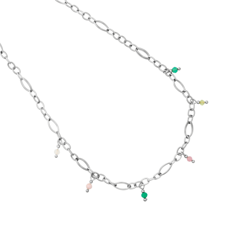 Smuk og feminin halskæde i stål med fine ædelsten. Halskæden er 42 cm + 3 cm forlænger.