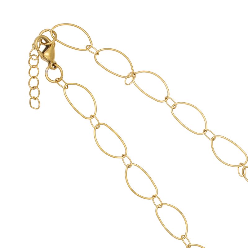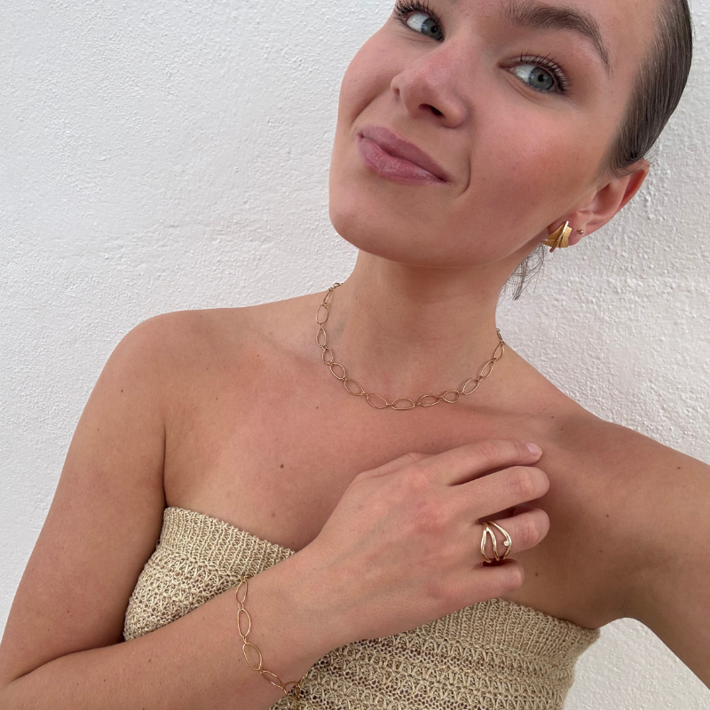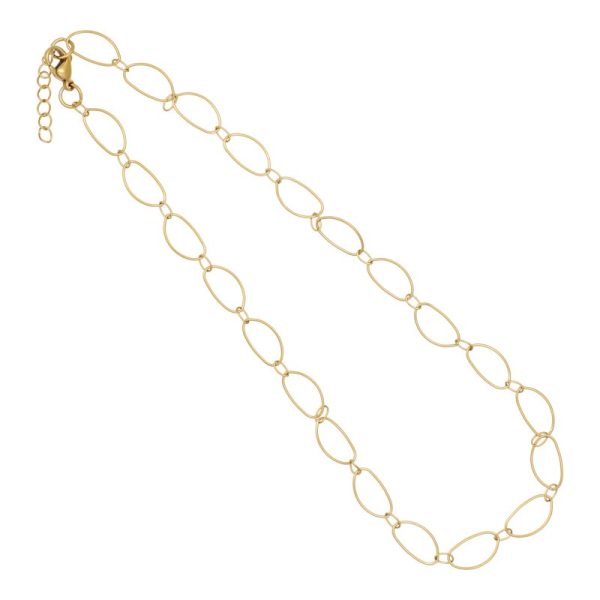 Smuk halskæde i stål, belagt med 14 karat guld, med fine ovale ringe. Halskæden er 42 cm + 3 cm forlænger.