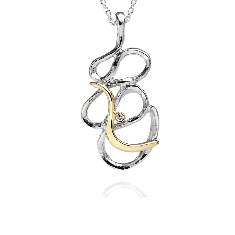 Luksuriøst halssmykke i sølv med 14 karat massiv guldpynt og en smuk 0,03 W/vs brillant. Et kunstværk for livet.