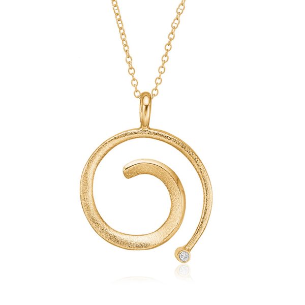 Skøn spiralformet vedhæng i matteret forgyldt sølv, udsmykket med en lille skinnende zirkonia.