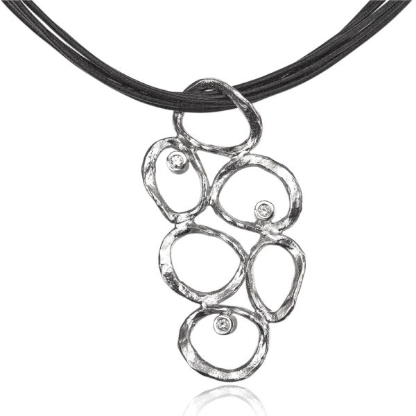 Halssmykke i sølv med rustik overflade og skinnende zirkonia. Smykket er iøjenfaldende og har kant.