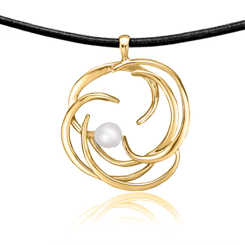Et smukt halssmykke i forgyldt sølv der kan ses. Smykket har et eventyrligt udtryk og er pyntet med en smuk ferskvandskulturperle.