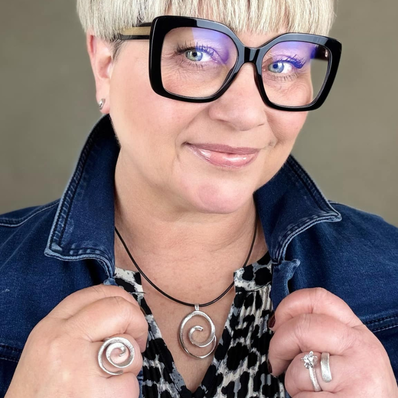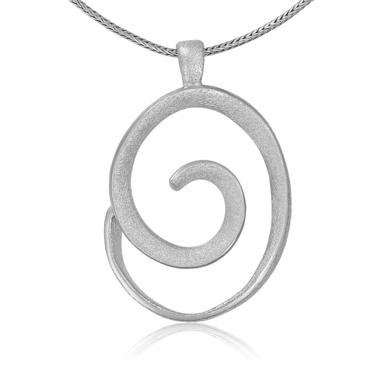 Elegant spiralformet halssmykke i matteret sølv med blanke kanter, der giver smykket et unikt og funklende look.