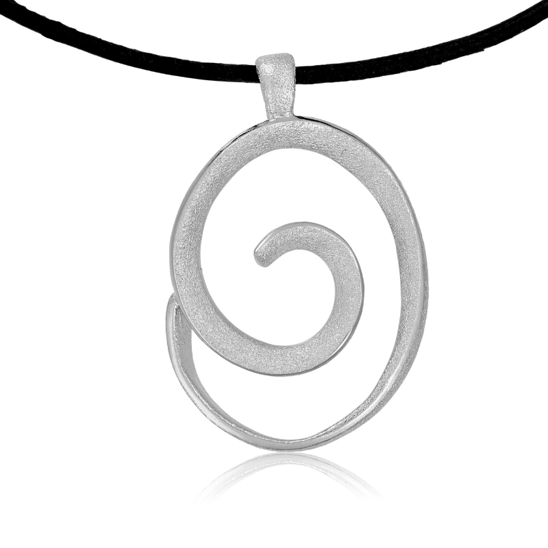 Elegant spiralformet halssmykke i matteret sølv med blanke kanter, der giver smykket et funklende look.