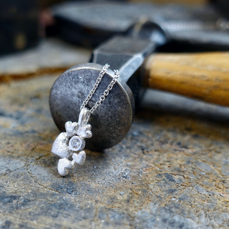 Smukt vedhæng i matteret sølv med sammensmeltede hjerter og en glimtende zirkonia.