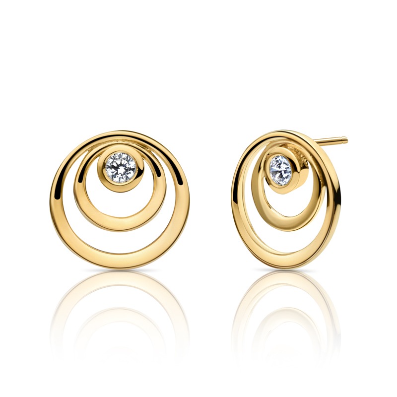 Øreringe i guldbelagt sølv med klassisk Blicher Fuglsang sving og smuk zirkonia.