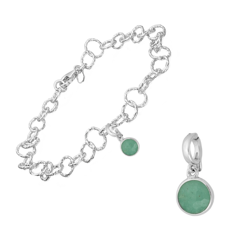 Klips i sølv som kan sættes på dit armbånd eller på din halskæde. Stenen og fatning er ens på begge sider. Klipsen passer til næsten alle armbånd og halskæder med ringe – se viste eksempel.
