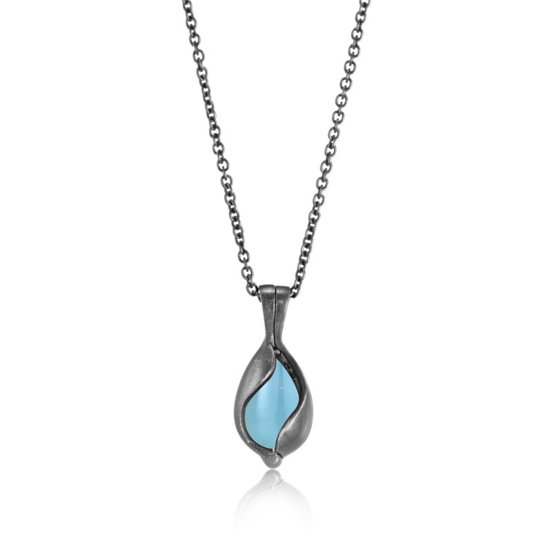 Halssmykke i oxideret sølv med aqua calcedon. Du kan nemt og enkelt kan skifte sten i halskæden.
