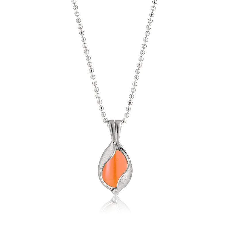 Halskæde i sølv med en rå icecrushed overflade og med orange karneol. Du kan selv skifte sten i smykket.