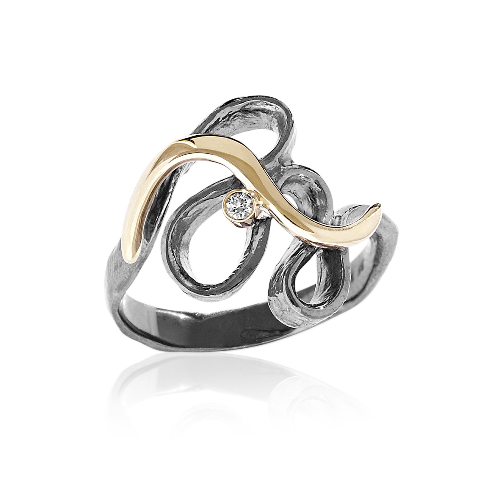 Elegant og luksuriøs sort rhodineret sølvring med 14 karat massiv guldpynt og 0,03 ct. W/vs brillant. Ikke bare et smykke men et helt lille unikt kunstværk.