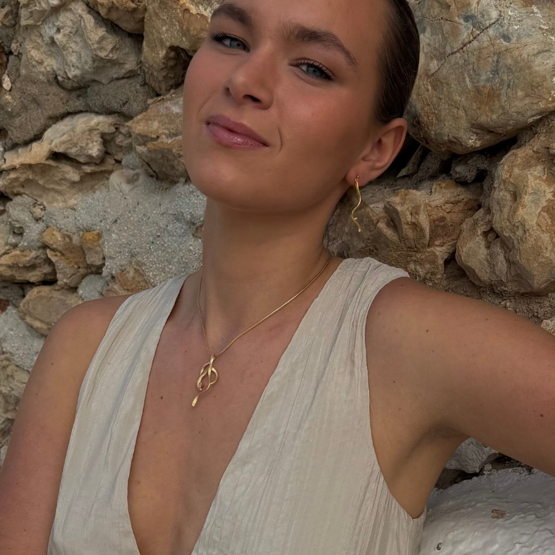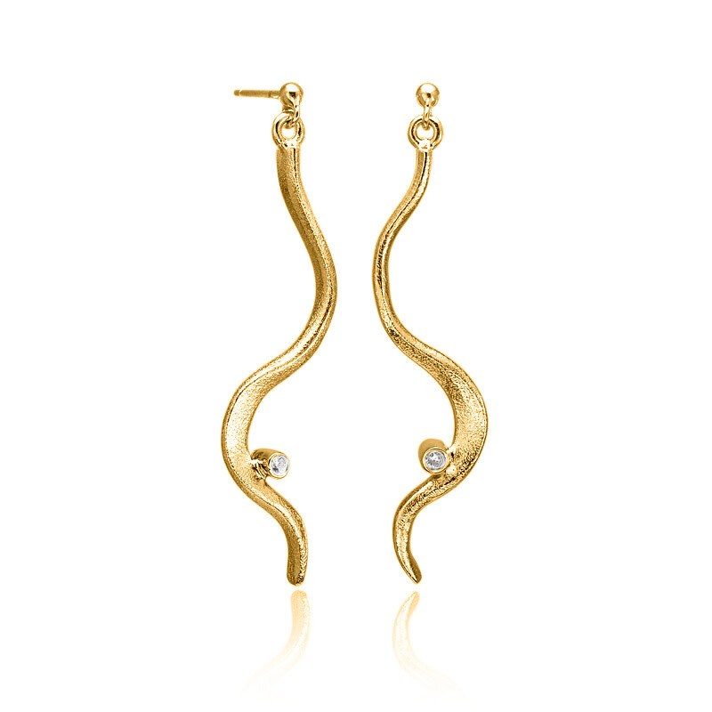 Feminine ørestikker i sandblæst forgyldt sølv med zirkoner, som er inspireret af bølgernes blide og legende former.