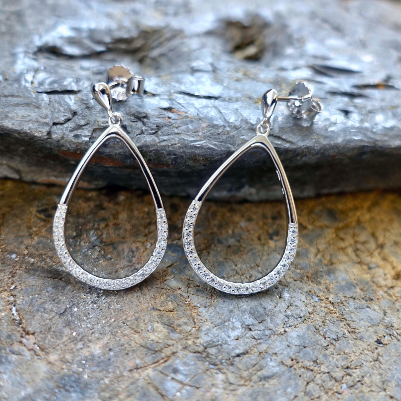 Smukke og stilfulde ørestikker i sølv. Ørestikkerne er i en dråbeform og dekoreret med funklende sten.