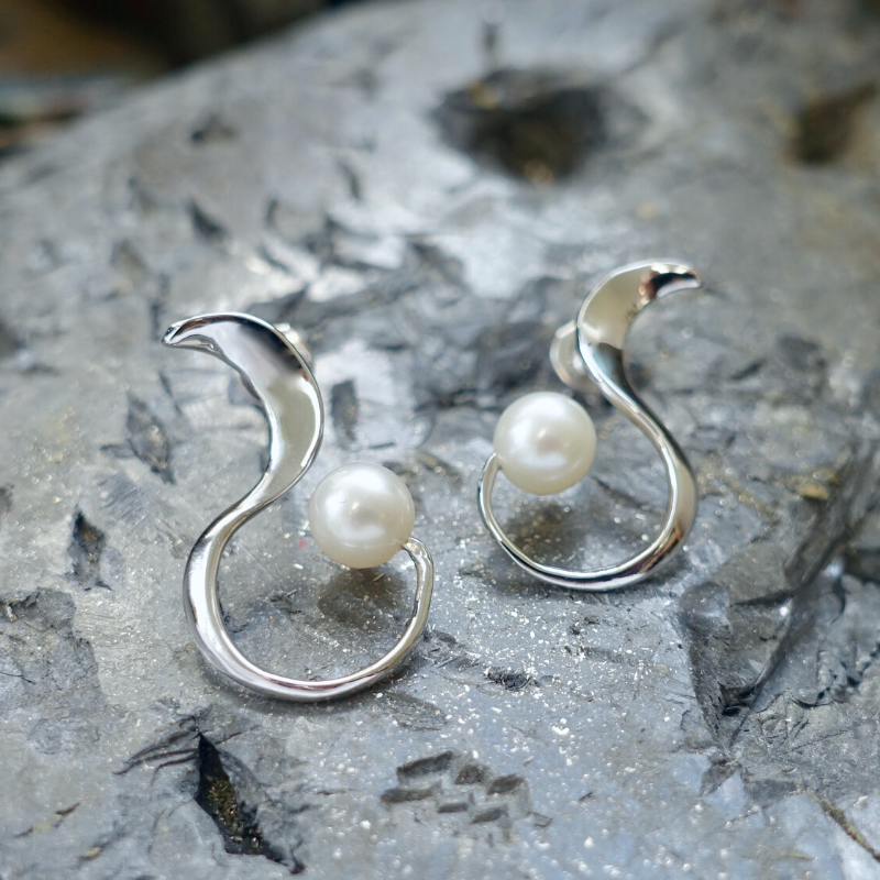 Ørestikker i blank sølv med smukke hvide ferskvandsperler.