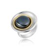 Unik ring i sølv og forgyldt sølv med en stor (1,5 cm i dia.) grå hæmatit. Ringen har en smuk kombination af de matte og blanke overflader.