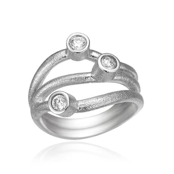 Smuk ring i sølv med 3 glimtende zirkonia, inspireret af havets bløde bølger.