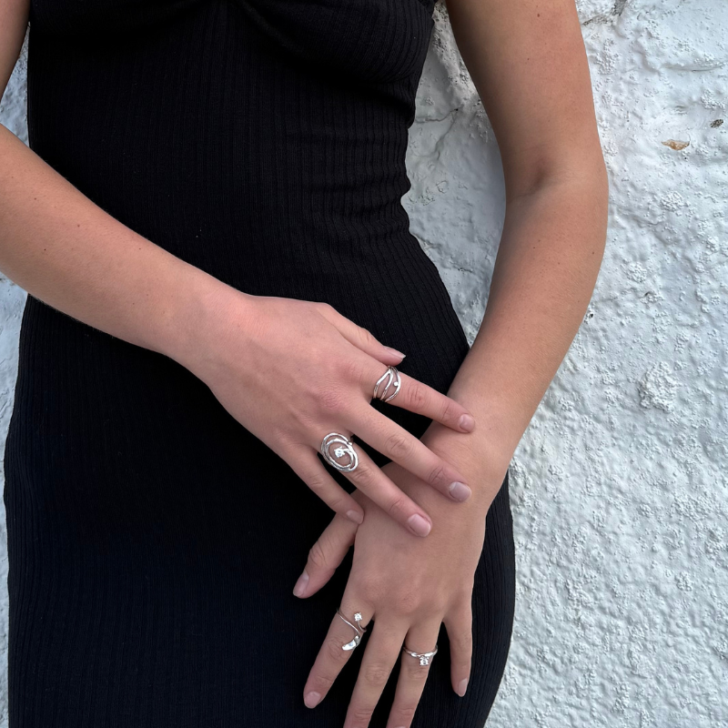 Rustik sølvring pyntet med hvid sten. Ringen ligger smukt over fingeren.