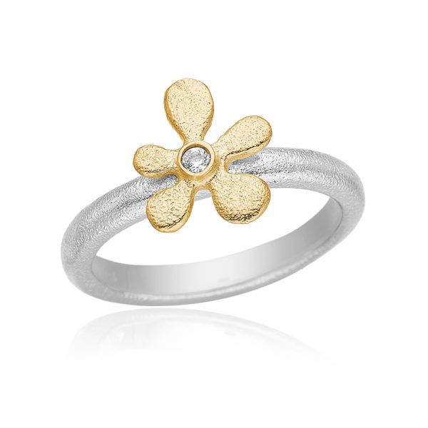 Feminin ring i matteret sølv med smuk guldbelagt blomst med hvid zirkon. Fin alene eller sat sammen med vores andre samleringe.
